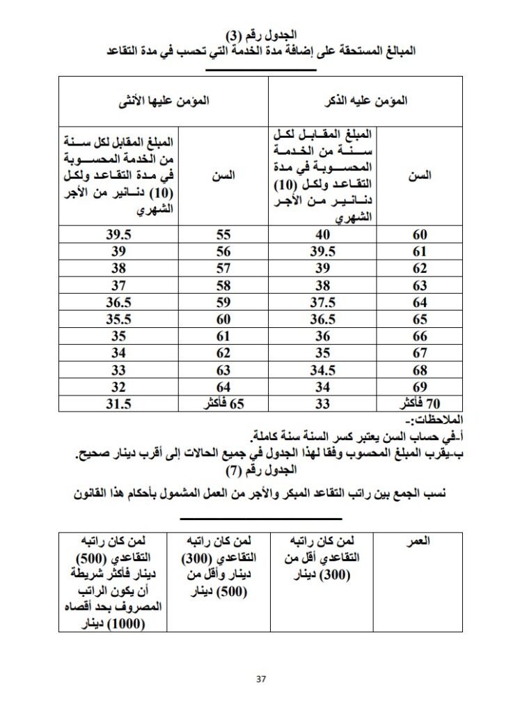 ي-لمجلس الوزراء بناء على تنسيب وزير الدفاع أو وزير الداخلية حسب مقتضى الحال الاستمرار بشمول المؤمن عليه العسكري بأحكام هذا القانون والذي أكمل المدة الموجبة لاستحقاق راتب التقاعد الوجوبي في الخدمة العسكرية وذلك خلال مدة ستة أشهر من تاريخ إكمال سن (60) للذكر أو سن (55) للأنثى، وحتى سن (65) للذكر وسن (60) للأنثى وفي هذه الحالة يحسب راتب التقاعد الوجوبي وفقا لأحكام الفقرة (ج) من هذه المادة مع تعديل معامل المنفعة وفقا لأحكام الجدول رقم (6) الملحق بهذا القانون.