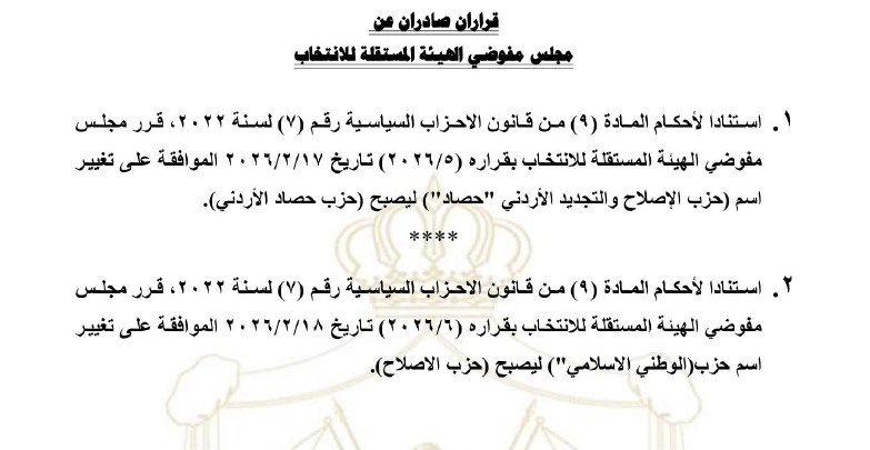 وبحسب الوثيقة، وافق المجلس في 17 شباط 2026، على تغيير اسم “حزب الإصلاح والتجديد الأردني – حصاد” ليصبح “حزب حصاد الأردني”.