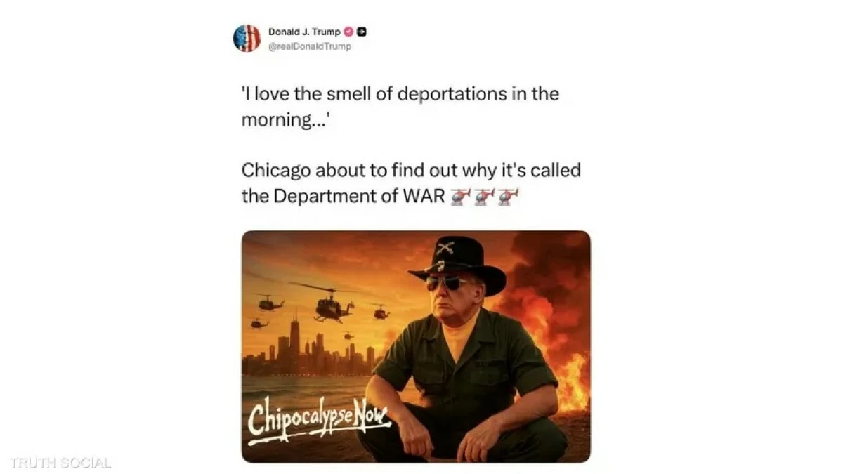 ضاعف الرئيس الأميركي دونالد ترامب، السبت، وعوده بإرسال الحرس الوطني وعناصر الهجرة إلى شيكاغو، من خلال نشر صورة ساخرة من فيلم “نهاية العالم الآن” تصور كرة لهب تحلق فوق ثاني أكبر مدينة في البلاد بينما تقترب المروحيات، ويظهر بها مرتديا زيا عسكريا.